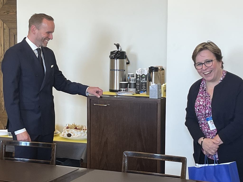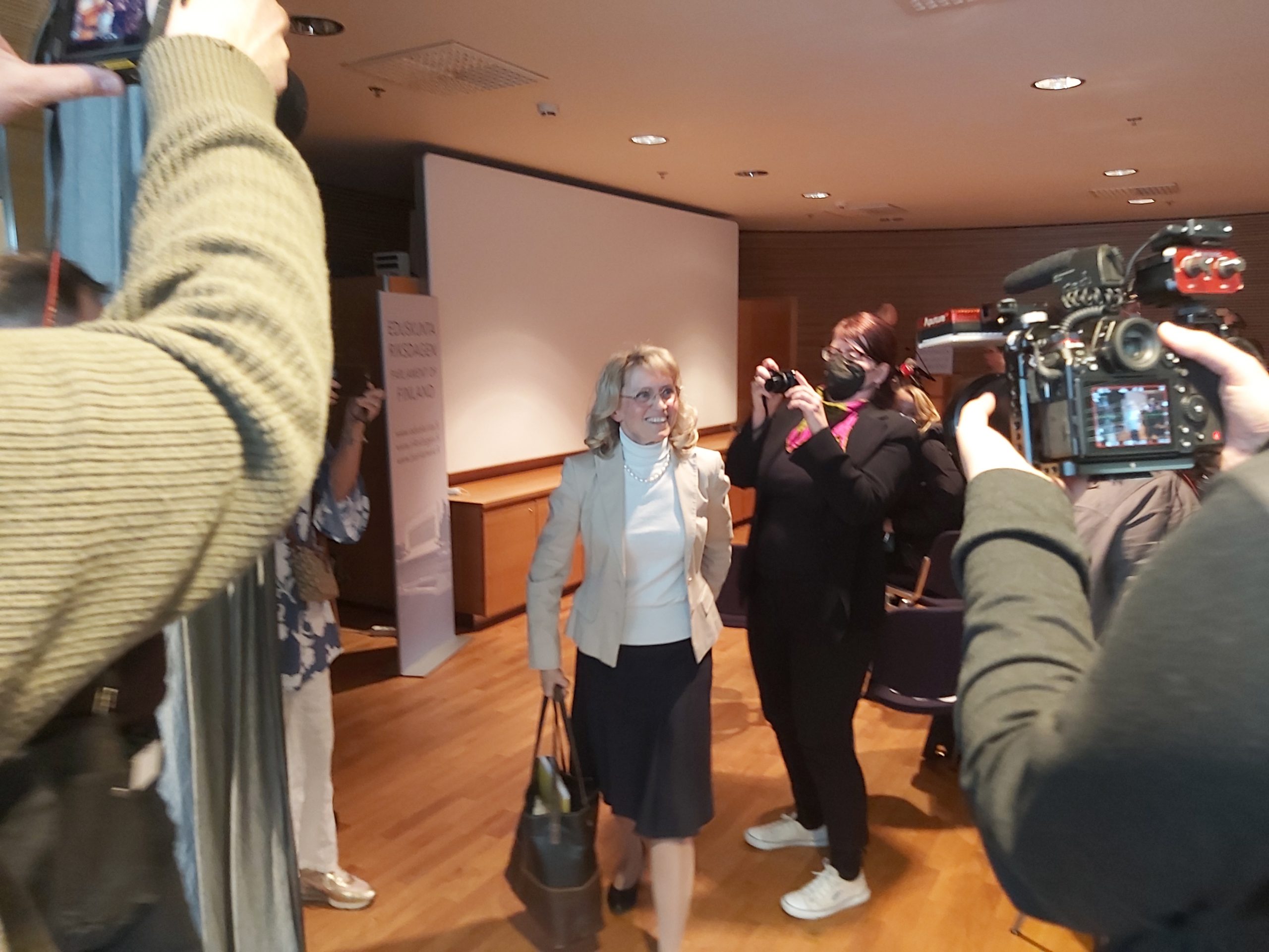 Tuoretta ministeriä Mika Poutalaa juhlittiin omien joukossa – Hurraukset ja kakkukahvit eduskuntaryhmässä
