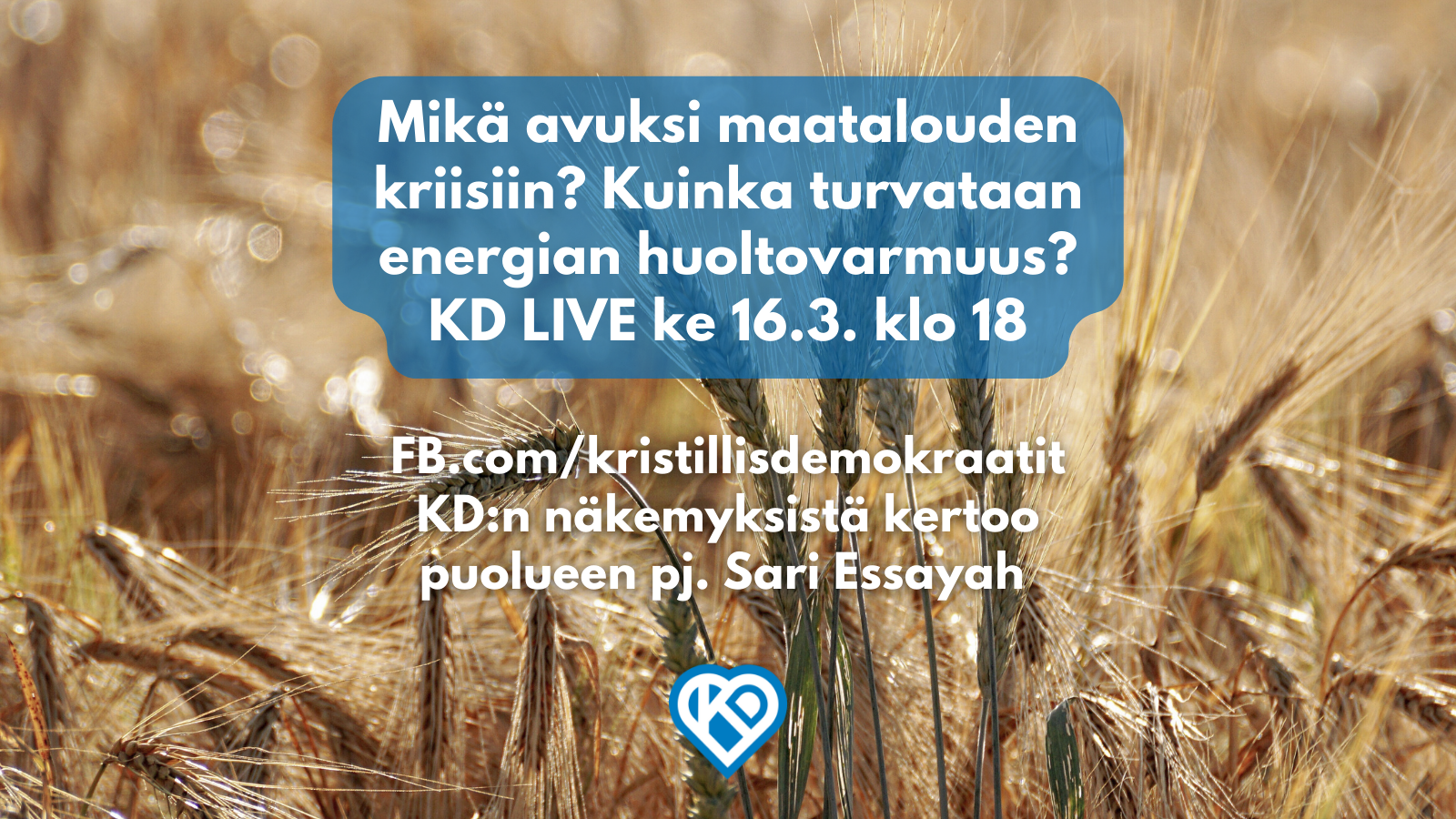 Maatalouden ja energian tuotannon turvaaminen? – Sari Essayah KD-LIVE:ssä ke 16.3. klo 18