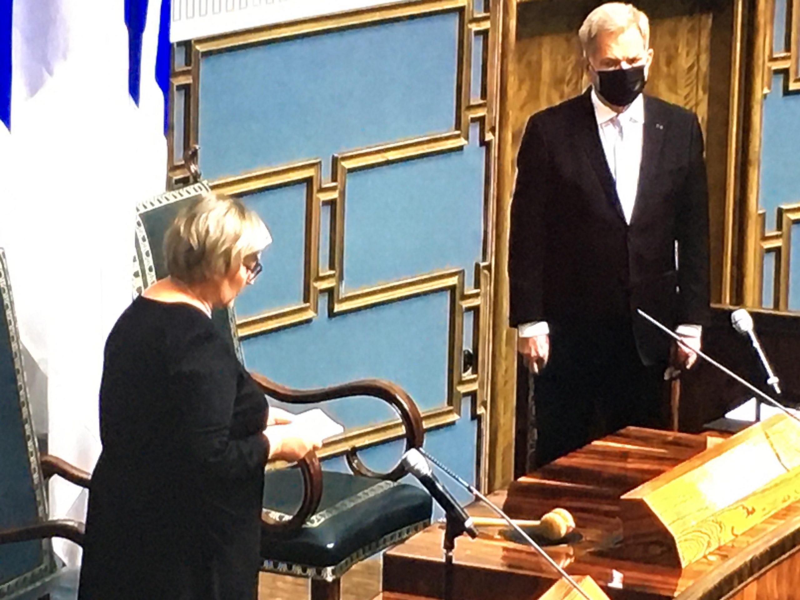 Tasavallan presidentti Sauli Niinistö puhui ilman maskia, mutta kuunteli puhemies Anu Vehviläisen puheen maski kasvoillaan. Vastaavasti Vehviläisellä oli maski presidentin puheen aikana. (Kuva Yle TV1:n lähetyksestä.)