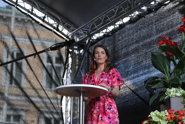 Katriina Hiippavuori juontamassa Kristillisdemokraattien SuomiAreenan lavatuntia Raatihuoneenpuistossa Porissa kesäkuun lopulla. (Kuva Kristiina Kunnas)