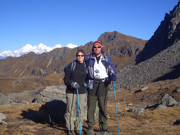 Timo Alaräisänen vaimonsa Lauran kanssa Himalajan vaelluksella Nepalissa. Alaräisänen on harrastanut vuorivaelluksia vaimonsa ja ystävien kanssa. – Lapissa vaellamme, Halti on vallattu moneen kertaan. Ulkomailla Kilimanjaro, Inka Trail Perun Andeilla, kolme pitkää vaellusta Nepalissa, hän luettelee.