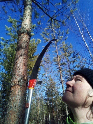 – Siitäpä kasvaa hyvä tukkipuu, sanoo taimikkoon oksasahansa kanssa lähtenyt Raija Iskanius koronaeristyksen aikaan 30. maaliskuuta.
