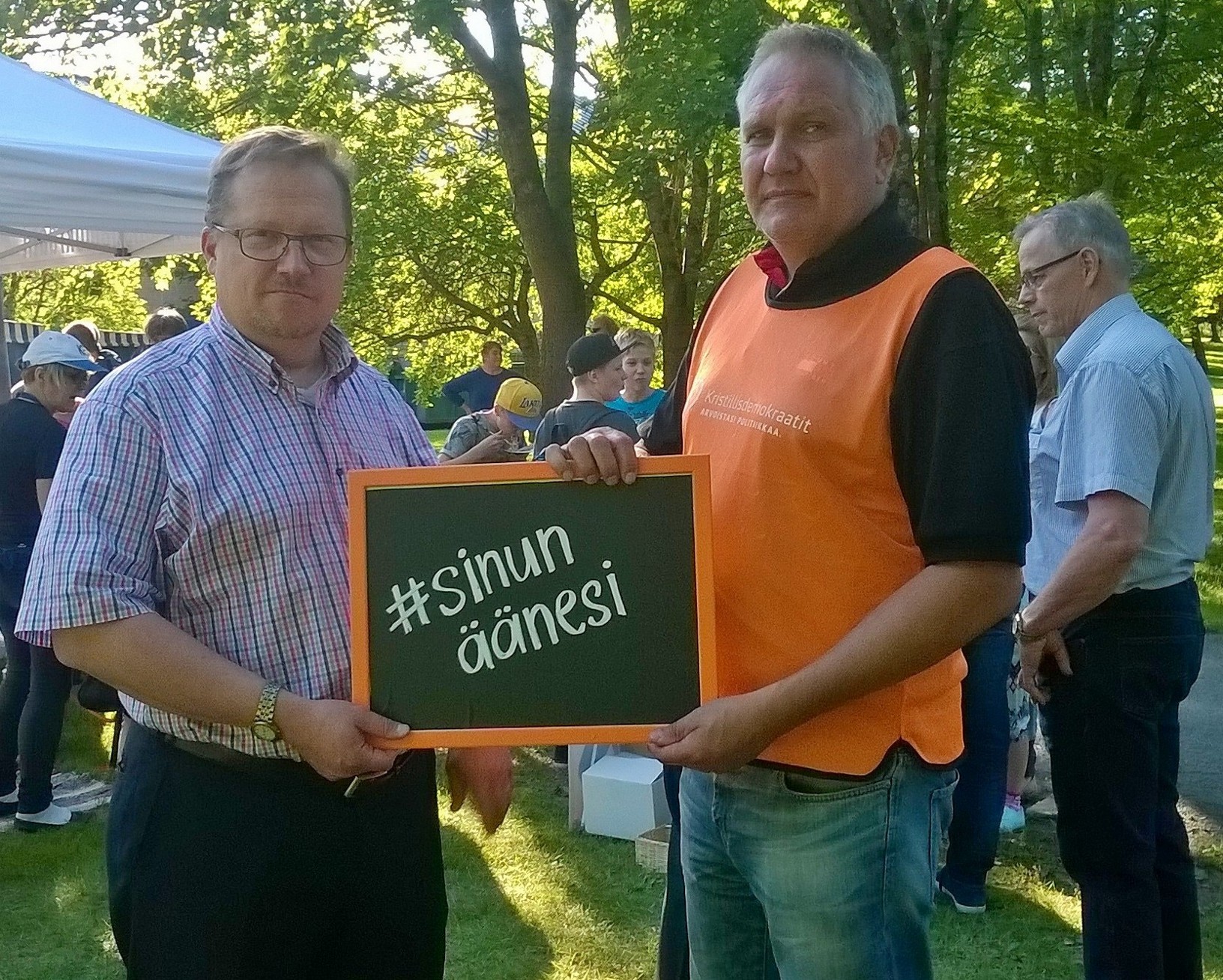 Nykyiset kaupunginvaltuutetut Sakari Smeds (vas.) ja Vesa Vainio kampanjoimassa 2016 ennen edellisiä kuntavaaleja. (Kuva Mikko Rekimies)