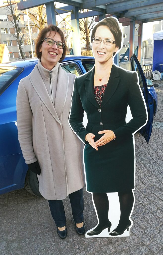Sari Essayah pahvi-Sarin kanssa Kouvolan torilla Kristillisdemokraattien 60-vuotismaakuntakiertueella huhtikuun lopulla. (Kuva Mikko Rekimies)