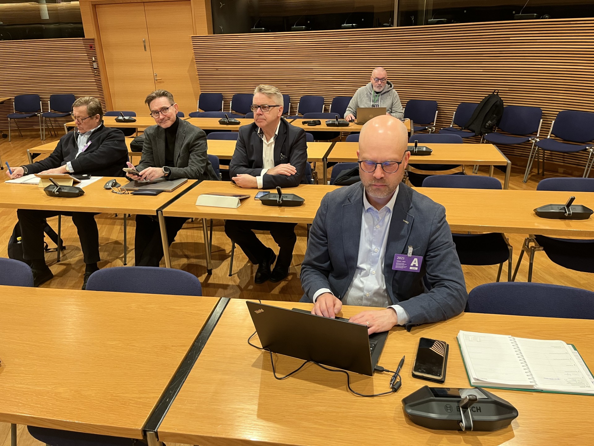 Puoluehallituksen kokoukseen osallistuvat Kristillisdemokraattien keskeiset vastuunkantajat, kuten piiripuheenjohtajat, puheenjohtajisto, kansanedustajat sekä osa puolueen työntekijöistä. Keski-Suomen piiripuheenjohtaja Pekka Tuominen, Keski-Pohjanmaan piiripuheenjohtaja Jani Andersson, kansanedustaja Peter Östman sekä 2. varapuheenjohtaja David Pettersson saivat kevään vaaleissa iloita lisäpaikoista ja kasvaneesta kannatuksesta. (Kuva Kristiina Kunnas)