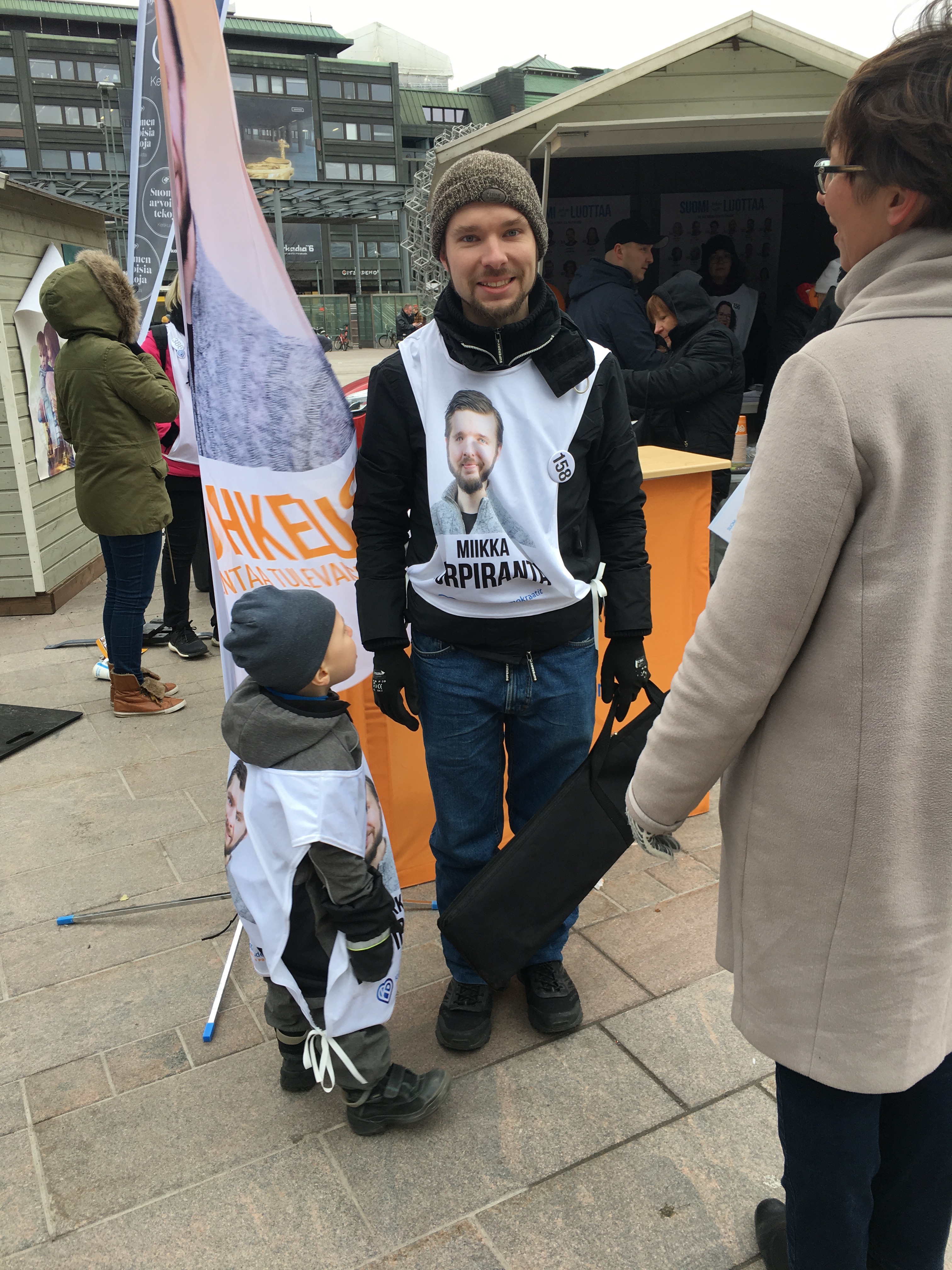 Miikka Korpiranta – sekä pieni ”vaalipäällikkö” – eduskuntavaalikampanjan aikaan Narinkkatorilla. Myös puolueen puheenjohtaja Sari Essayah vieraili torilla. (Kuva Kristiina Kunnas)