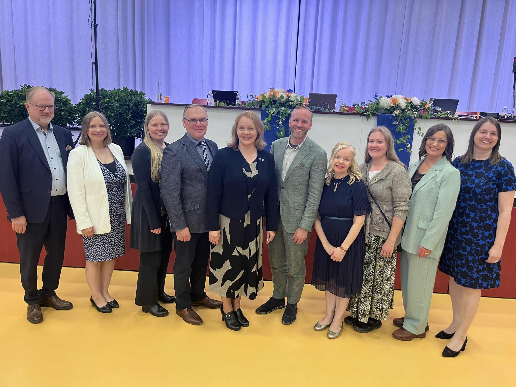 Varapuheenjohtajaehdokkaat yhteiskuvassa. Vasemmalta Jukka-Pekka Kuokkanen, Sirpa Pursiainen-Hautala, Annukka Ojala, Pentti Ahopelto, Sonja Falk, Mika Poutala, Susanna Kokkonen, Aila Asikainen, Ann-Niina Turunen sekä Hanna-Lea Ahlskog. (Kuvat Kristiina Kunnas)