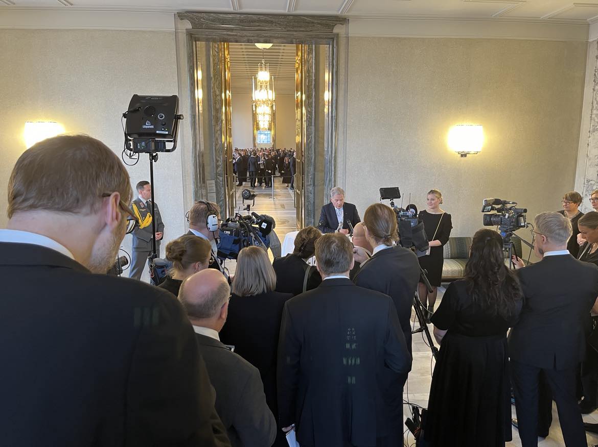Tasavallan presidentti Sauli Niinistö avasi virkakautensa viimeiset valtiopäivät. Sankka joukko toimittajia ja kuvaajia osallistui lehdistötilaisuuteen. – Puheeni pitämiseen suhtauduin samoin kuin ensimmäiseen puheeseeni 12 vuotta sitten. En näissä tunteile, hän vastasi miltä nyt tuntuu -urheilukysymykseen. (Kuva Kristiina Kunnas)