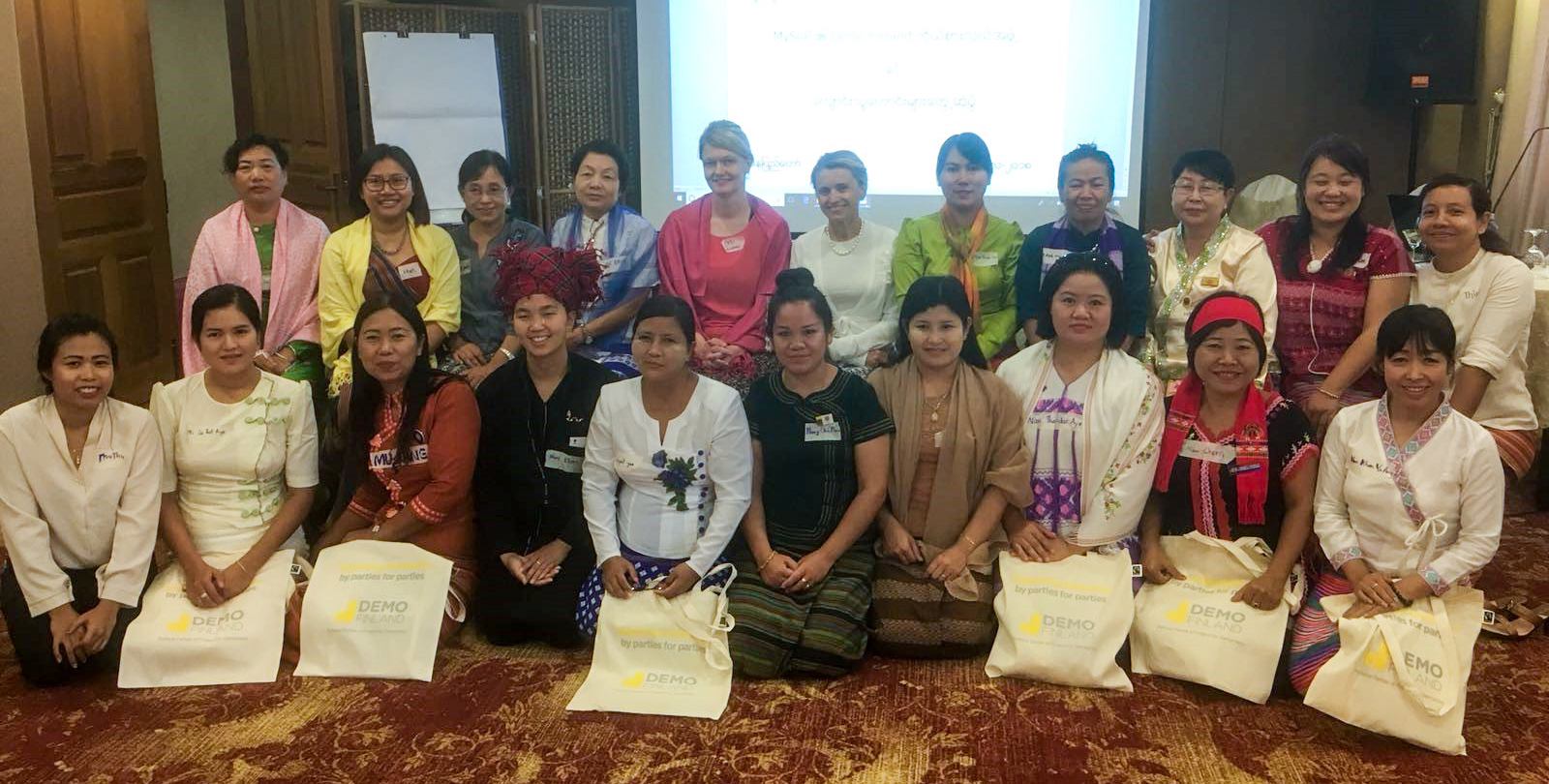Myanmarin politiikkakoulun naisalumnit kuudestatoista eri puolueesta tapasivat Demon edustajat. Mukana takarivissä Päivi Räsänen ja Anu Juvonen.