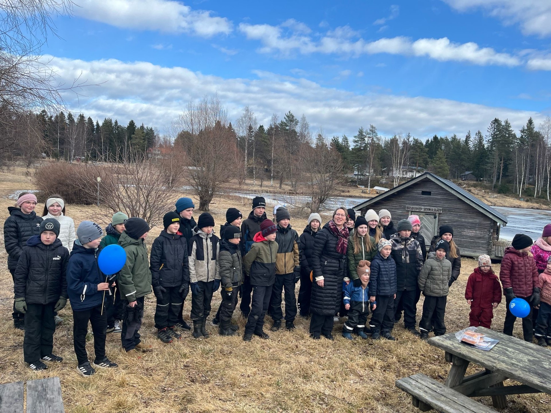 Maa- ja metsätalousministeri Sari Essayah pääsi Luodon lasten ja nuorten kanssa yhteiskuvaan. (Kuva Roope Knapp)