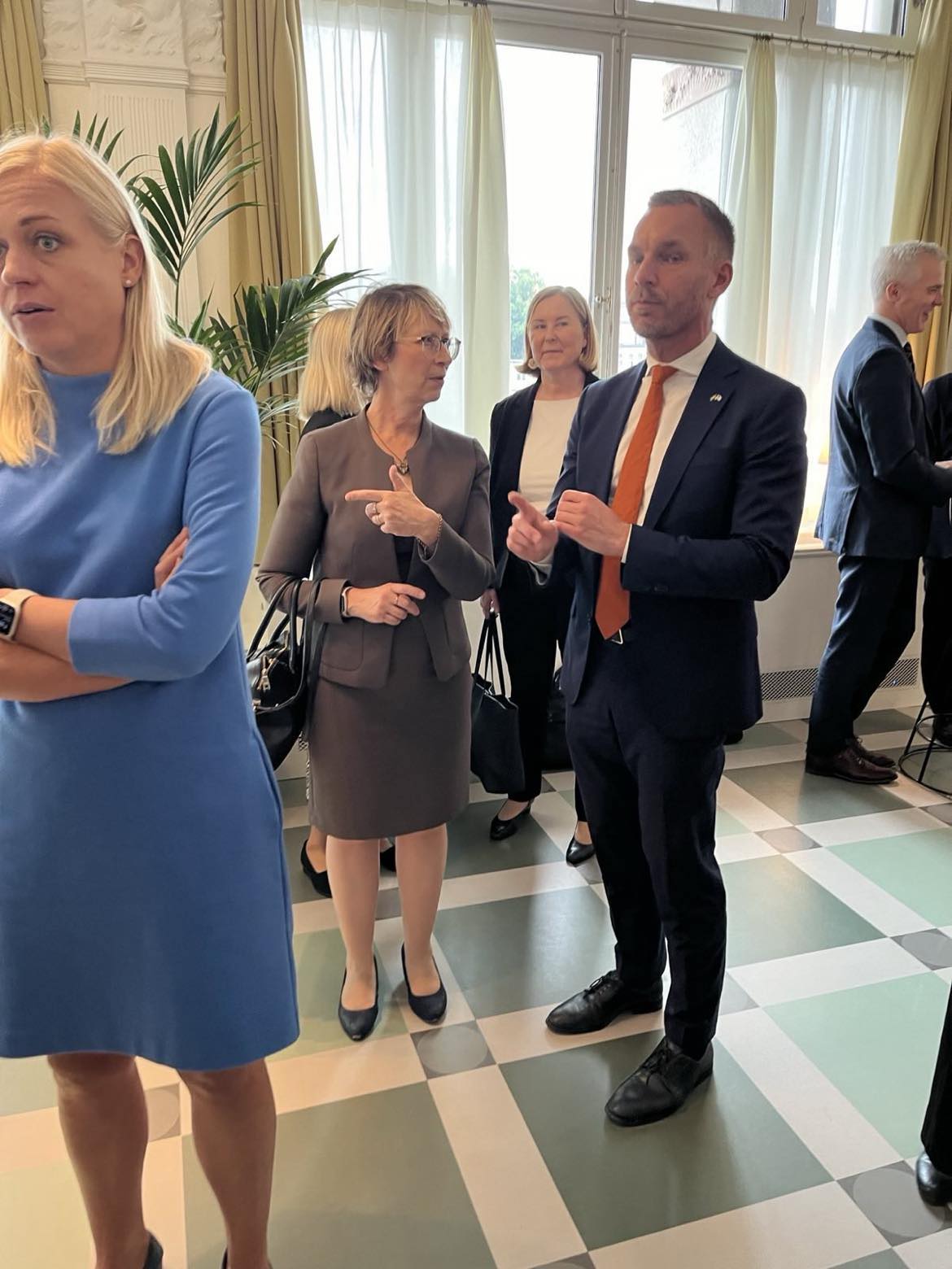 Sari Essayah ja Ruotsin siviiliministeri Erik Slottner (KD) juttelevat, vasemmalla ulkoministeri Elina Valtonen, takana sosiaali- ja terveysministeri Kaisa Juuso sekä opetusministeri Anders Adlercreutz. (Kuva Marjo Loponen)