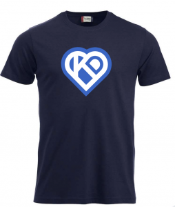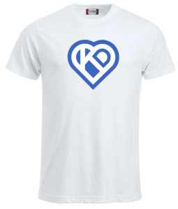 A: KD-paita valkoinen tai sininen 100 % puuvillaa (XS, S, M, L, XL, XXL, 3XL), unisex-malli. Huom. M-koko loppunut sinisestä paidasta.